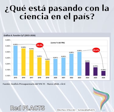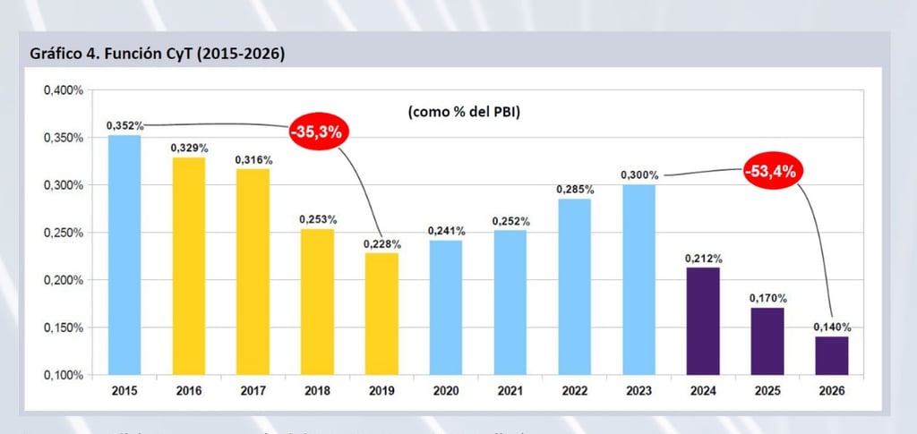 La inversión en Ciencia y Tecnología como porcentaje del PBI pasó del 0,352% en 2015 a un proyectado 0,140% en 2026. Una reducción del 53,4% que sitúa a la Argentina en mínimos históricos de inversión científica.